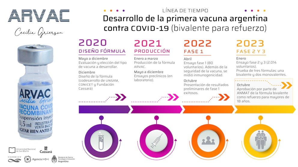 ARVAC Cecilia Grierson es un desarrollo de la Universidad Nacional de San Martín, el CONICET y el Laboratorio Cassará, con apoyo de la Agencia Nacional de Promoción de la Investigación, el Desarrollo Tecnológico y la Innovación (Agencia I+D+i), Del Ministerio de Ciencia, Tecnología en Innovación